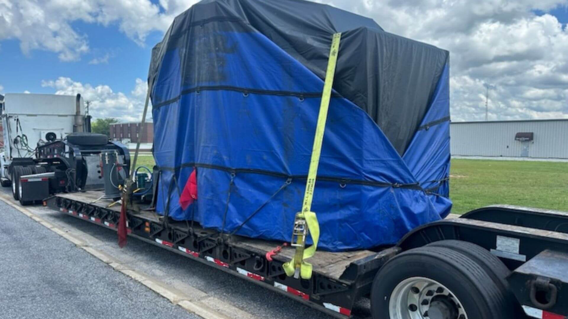 It depends on height and sensitivity. A Step Deck or Double Drop is great for taller machines. For ultimate protection from weather and road debris without tarp contact, a Conestoga trailer is the best service option.